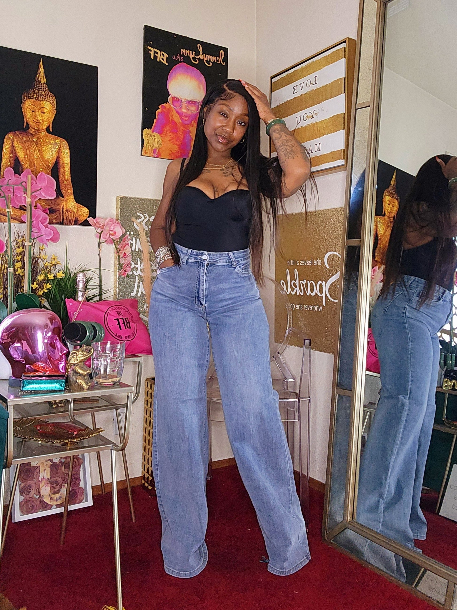 - High Waisted Wide Leg Medium Wash Denim Jeans